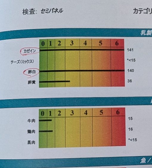 アレルギー反応としては、小麦、牛乳、卵がグラフを振り切って反応が出ておりました。(ちなみに『量』はそんなに食べてません…)