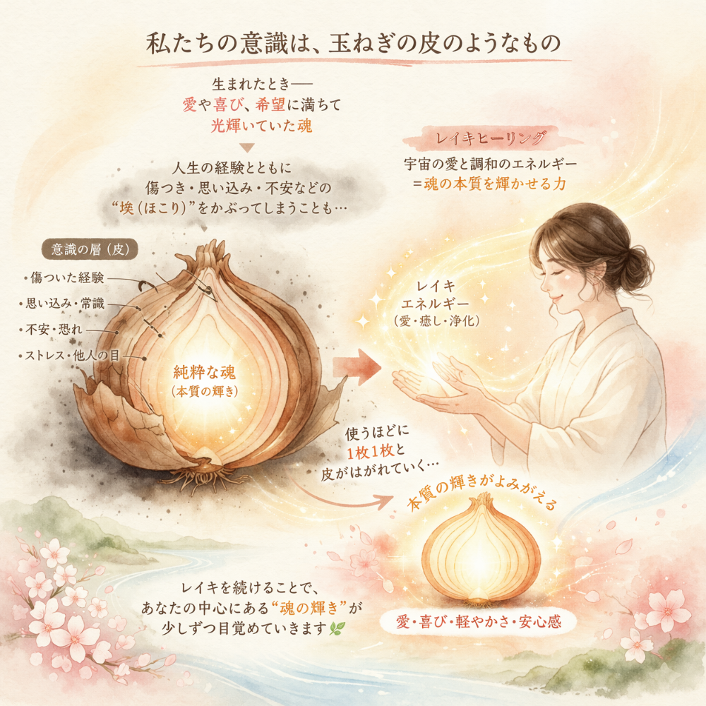 『レイキ』は、使えば使うほど、エネルギーの通りが良くなるだけでなく、玉ねぎの皮を1枚1枚はぐように、皆さまの一番中心にある、『本質の輝き』をめざせさせてくれます。